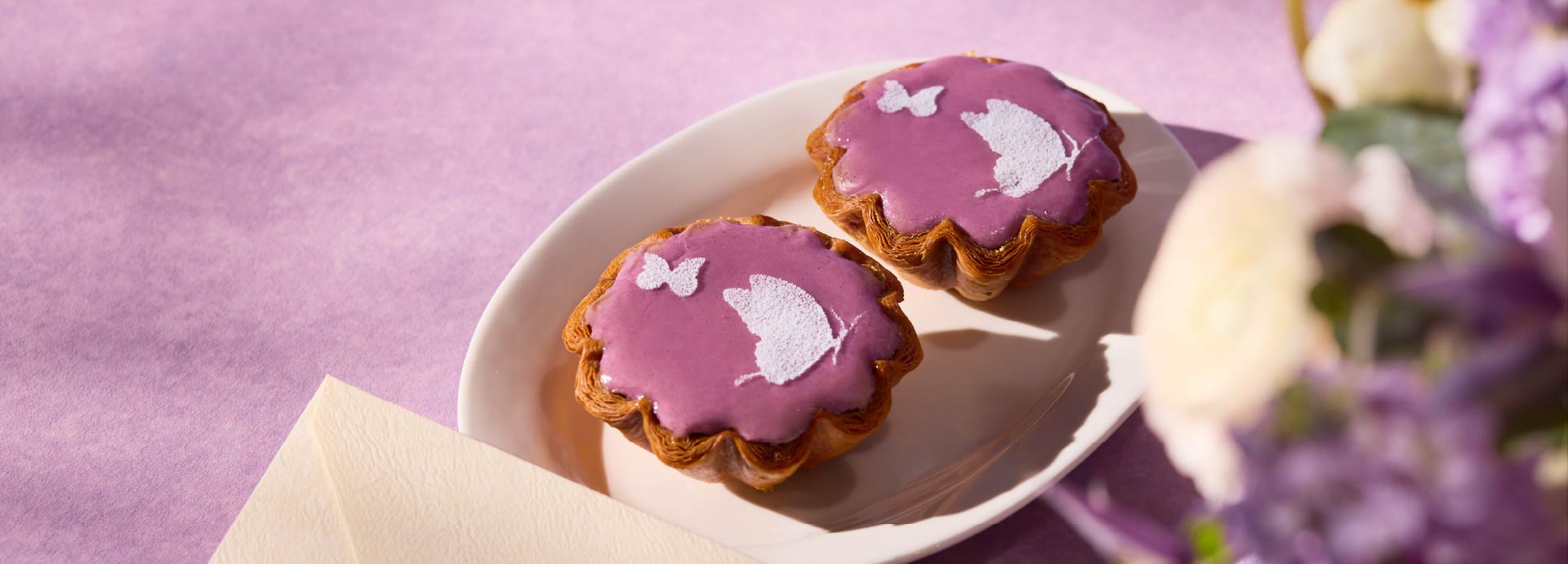 Discover the art of floral arrangement with the expert florists from our resident flower shop Blooms & Blossoms. Take home your own handcrafted arrangement, complemented by two pieces of limited-edition Hokkaido Taro Flans from our Butterfly Patisserie for a sweet finishing touch.